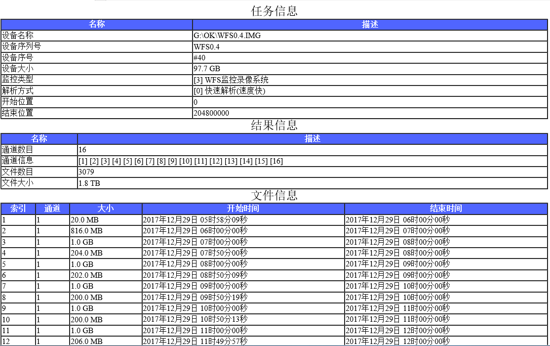 日志报表结果包括:任务信息,通道信息,文件数量,文件总大小,文件详细列表。